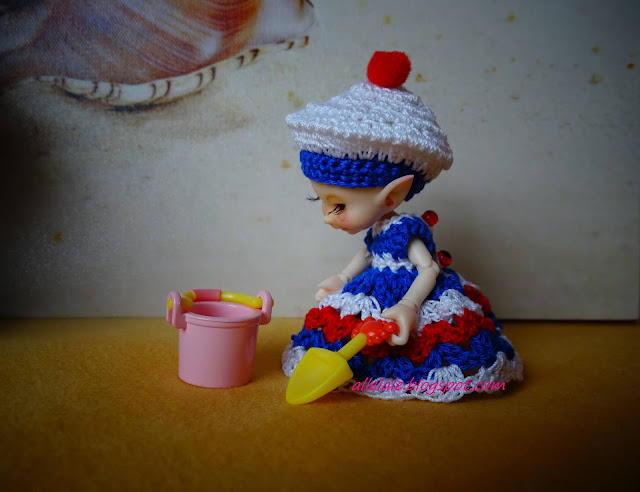 Obiecałam pokazać Wam ubranko, jakie kilka dni temu mi się przyśniło. Udało mi się mniej więcej je odwzorować. Na drutach zrobiłam czarną bluzeczkę z dekoltem carmen a na szydełku spódnicę, z cienkiego kordonka z dodatkiem, złotej, metalizowanej nitki. Kiedy ubrałam w te ciuszki Millie, od razu skojarzyła mi się z Paryżanką. Sesja miała powstać na dworze ale niestety moje miasto nawiedziła plaga komarzyc. Są małe, są zjadliwe, są wszędzie i jest ich tysiące. Wyjście do ogrodu to wyzwanie dla ludzi o mocnych nerwach. W tej sytuacji musiałam się zadowolić tym co mam i sesja powstała w domu. Mam nadzieję, że choć trochę wygląda to jakby Millie była w stolicy Francji ;) Jeśli nie, to od czego jest wyobraźnia.
